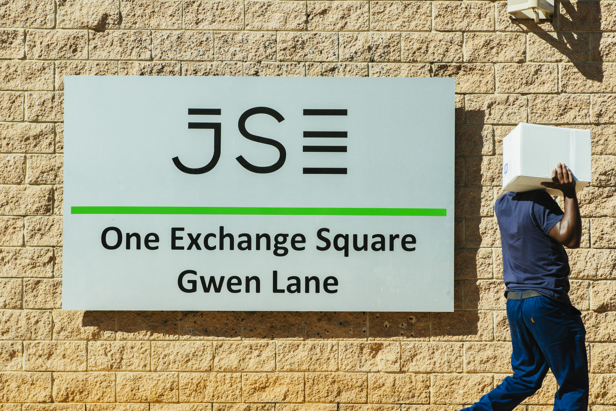 A man passes a sign outside the Johannesburg Stock Exchange in the Johannesburg.