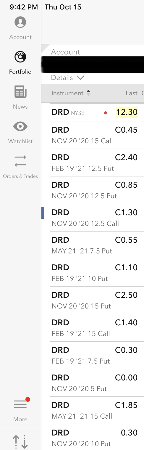 I have equal number / amount wagered on DRD short put / call strike-12.5, expiration November 20th