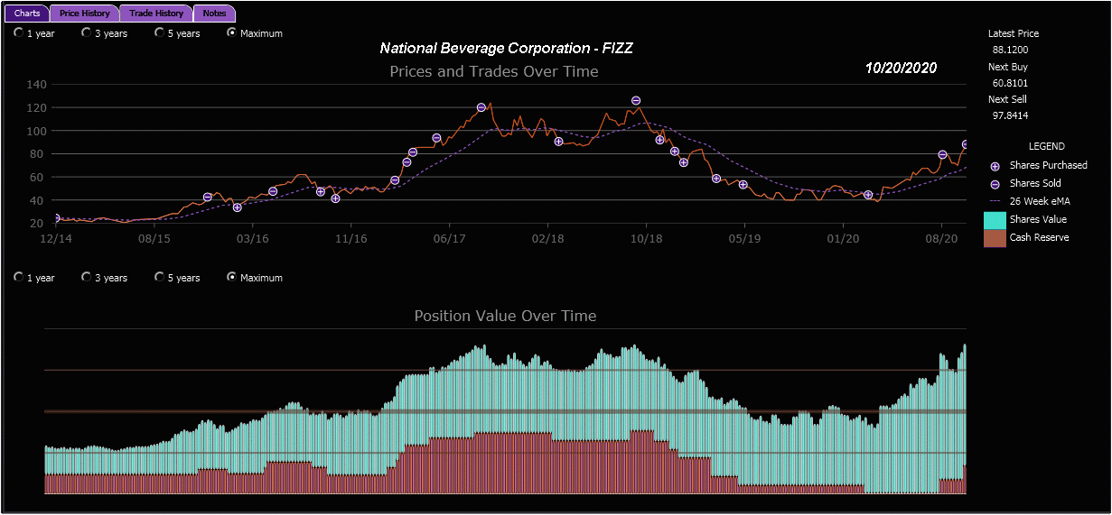By using strict AIM Inventory Control this holding is currently equal to it's previous all time high value point even though it's still $32/share lower in price than back then. While Roller Coasters are fun, they can be a bit scary, too. AIM has done a remarkable job of managing FIZZ even as the price/share dropped from around $120/share to just $44.50 a share back in March. The price/share was $88.12 this AM and tripped the latest AIM directed sale of 10% of inventory.