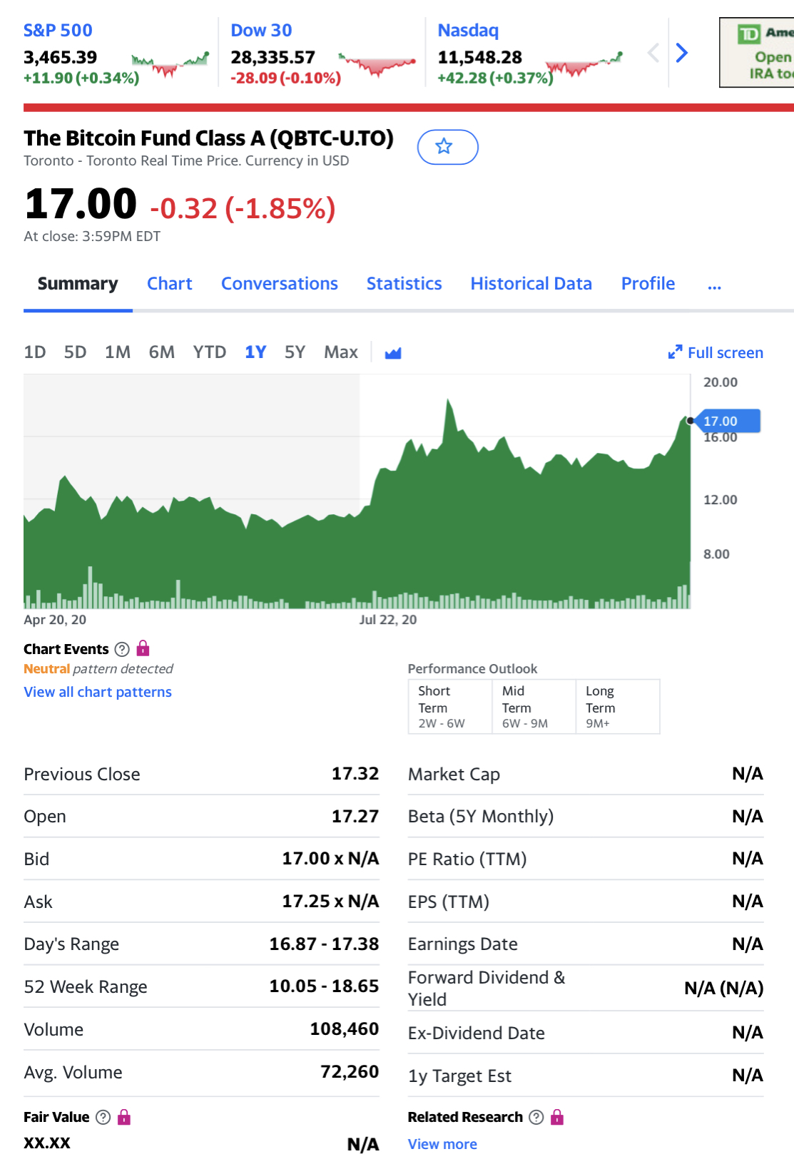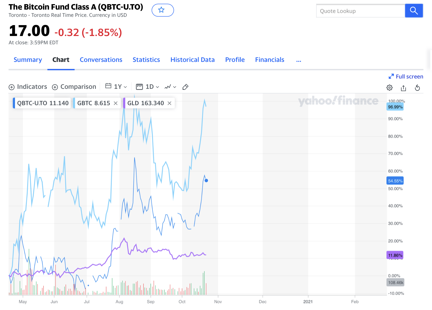 It also does not have any use other than holding something not useful. It is cheaper because it has a market cap of ~120M CAD, whereas GBTC is at 2.5B USD, and both together w/ all BTC in the universe, sums to ~200B, relative to gold, that which is much harder to lift by mania at this stage, at 11T