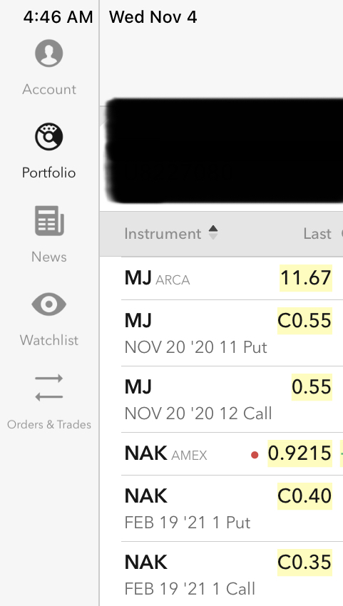 (3) The MJ position is same size as the NAK position, so am positioned for a Biden / Trump win-win / lose-lose, and certainly intend to make money on both trades