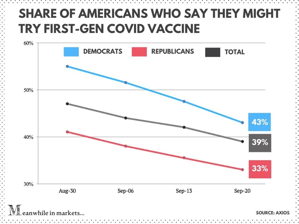 People won’t rush to shoot up. A recent Axios poll found that more than 65% of Americans aren’t willing to get Covid shots. And the ranks of Covid “anti-vaxxers” are growing by the day, as you can see: