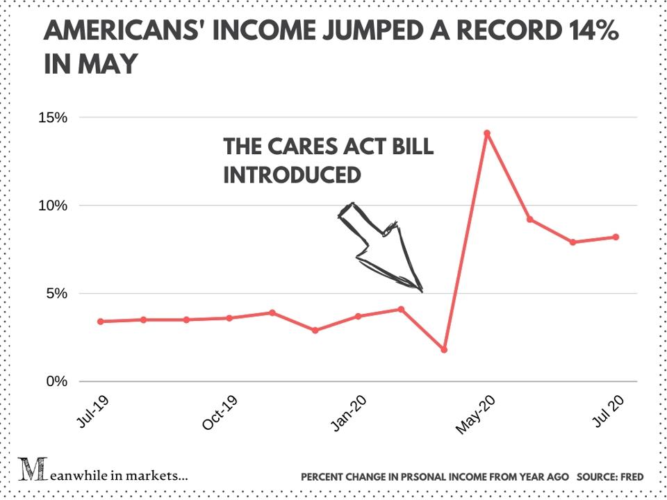A NBER study showed that two-thirds of unemployed Americans were getting benefits greater than their lost earnings. And as I’ve talked about before, stimulus boosted Americans’ income to record levels: