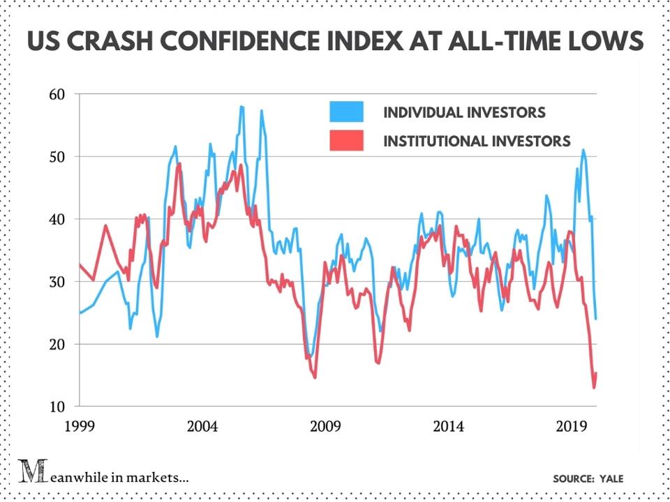 Take a look at the U.S. Crash Confidence Index constructed by Nobel-winning economist Robert Shiller. The lower the reading, the bigger the share of investors who think we may be headed for a catastrophic crash like 1987’s Black Monday.