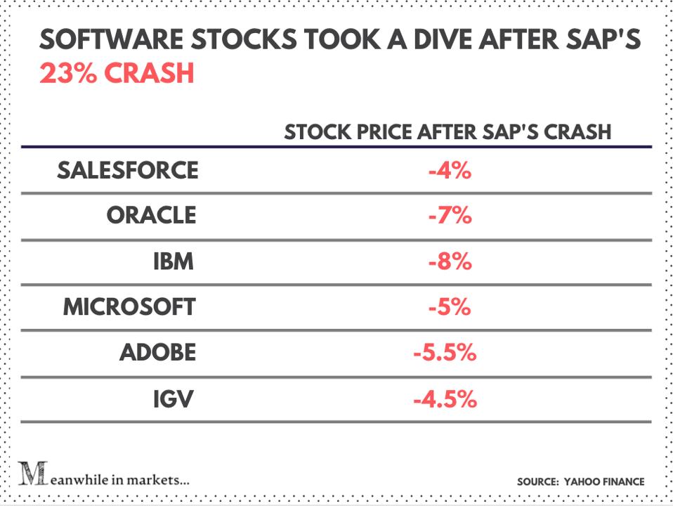 SAP’s American peers Salesforce CRM 0.0%, Oracle ORCL +0.2%, IBM IBM -0.6%, Microsoft MSFT +0.2%, and Adobe ADBE -0.4% plunged 4%, 7%, 8%, 5%, and 5.5% on the news. And a broader basket of software stocks (IGV) IGV +0.8% dropped 4.5%: