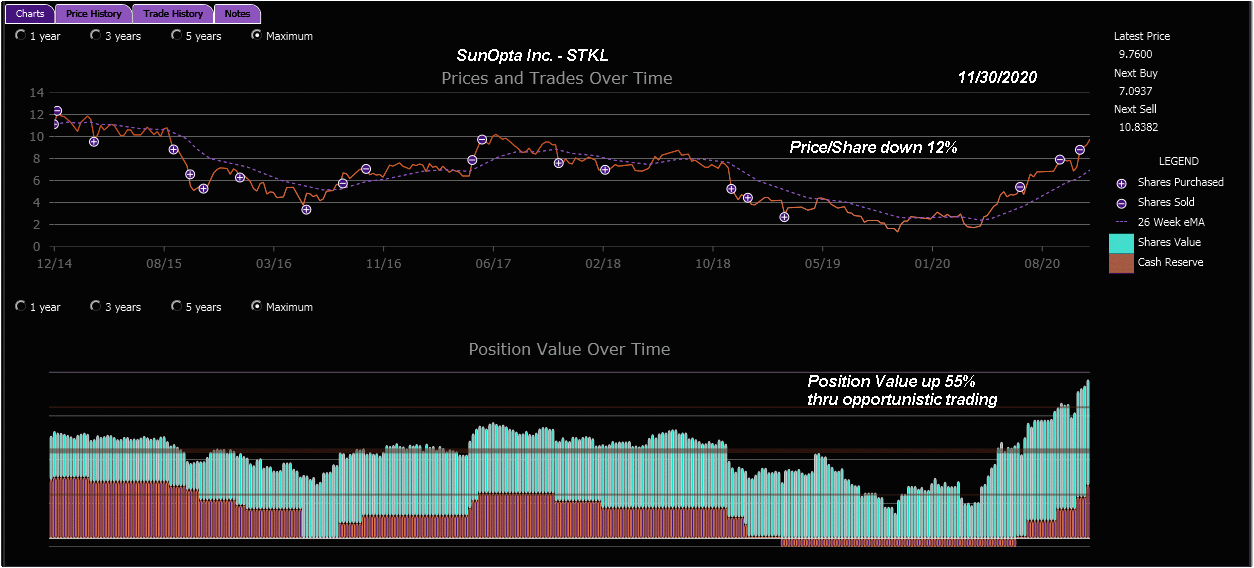 This is a component of a "water and beverage" portfolio. Since Sunopta makes organic fruit extracts that get used in other prepared foods and beverages it fits and has been kept. Managing the ownership has been a challenge but Mr. Lichello's AIM investment management method has done a good job.