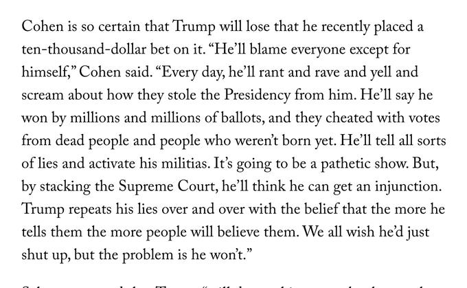 Fascinating. @MichaelCohen212 describing the aftermath of Trump's defeat to @JaneMayerNYer in an article that appeared just before the election.