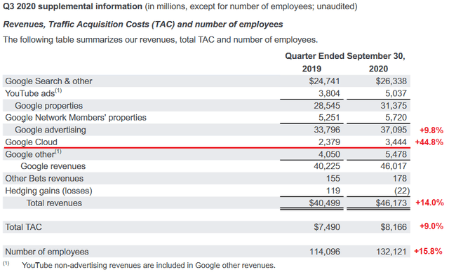 The Google Cloud Platform ("GCP") will be a growth driver.The Android operating system, the #1 global OS for smartphones, will continue to drive mobile search.Google Search will continue to thrive, with advertising revenue likely to rebound strongly in 2021 as vaccines penetrate the population.The significant cash position ($132.6 billion at the end of Q3) and the company's strong FCF generation enable Google to continue to invest in innovation and long-term growth opportunities. Earnings In late October, Google (i.e., Alphabet) released its Q3 earnings report that showed the company had recovered from the prior two quarters of relative stagnation that led to my September Seeking Alpha article, " Google: FANNG's Red-Headed Stepchild." The Q3 revenue breakdown: