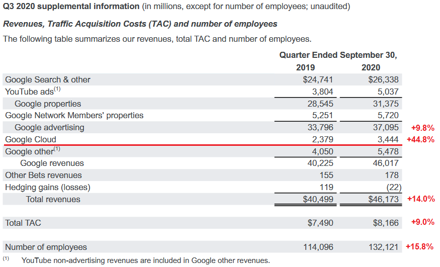 As can be seen in the graphic above, Google advertising revenue was up 9.8%, Google Cloud hit it out of the park with revenue up nearly 45%, and total revenue was up 14% yoy. This was achieved by TAC growing only 9%. However, it was still somewhat concerning to me as a shareholder that the number of employees grew by almost 17% yoy.