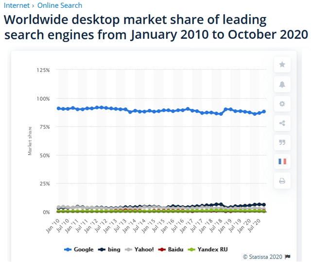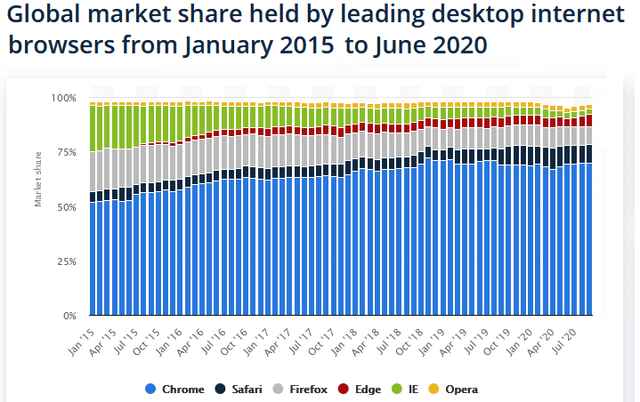 In an oft-neglected part of GOOG's ecosystem, note that its Chrome browser also dominates the market. It's just another way that GOOG can acquire user data and then use techniques such as AI and machine learning ("ML") to optimize monetization of that data - primarily through advertising revenue.