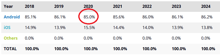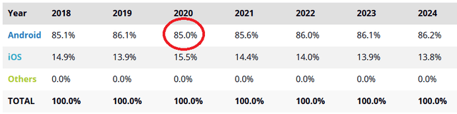 In addition, the Google Android operating system continues to dominate the global smartphone OS market. That doesn't look to change anytime soon, as Android's market share is actually expected to marginally increase over the coming years: