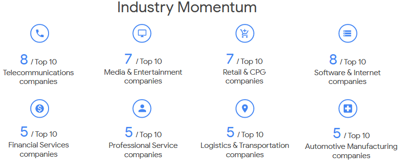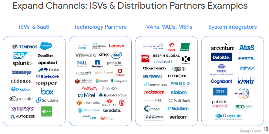 Deliver a Distributed Infrastructure as a Service (Public, Hybrid, Edge)Provide a Digital Transformation Platform (Apps, AI & ML, Analytics, Collaboration).Provide Industry-Specific Digital Transformation Solutions (Retail, Health Care, Industrial, Financial Services, Media & Entertainment). One of the primary ways Google is working to drive GCP growth is by expanding distribution channels by developing new - and deepening existing - partnerships: