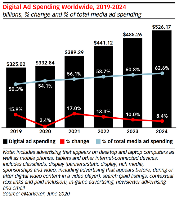 Annualizing Q3's $16.85/share in FCF gets to $67.40/share. At $2,100/share, that's only 31x that FCF estimate. This estimate is very conservative because it assumes no FCF growth next year over Q3's result - which hard to imagine with a rebound in AdTech revenue and GCP growing at 40%+. Note that Emarketer expects Google's AdTech revenue to increase by 20% next year and for overall digital ad spending to increase by 17% next year (see below).