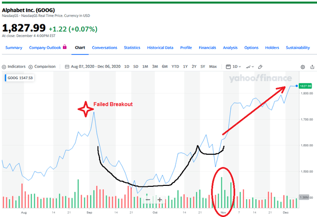 The Stock Chart From a technical point of view, Google appears to have broken out to the upside from a classic Investor's Business Daily cup and handle formation: