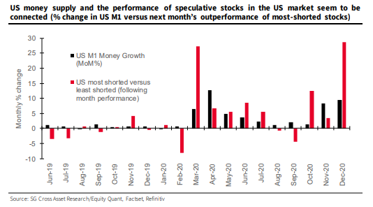 There is no libertarian objection to stopping behavior that endangers others. Libertarians can agree that nobody should be allowed to drive a car when drunk. Distorted markets, and particularly asset bubbles, lead to malinvestment and wasted capital, and ultimately to lost jobs. The Federal Reserve is adamant that it cannot and should not attempt to identify and deflate bubbles before they grow too big. Incidents like this suggest that they need to be more active. Do you really want the Federal Reserve to be focused on the prices of individual stocks? That seems like bringing a bunker buster to a knife fight. And again, who gets to decide if the price is wrong?It’s not a question of getting involved in individual stocks, but of macro-prudence. Knowing when a bull market has turned into a speculative bubble is difficult. But some kind of contra-cyclical system to tighten conditions when markets look excessive would be good. It’s the opposite of what we have at present. It is hard to imagine anything like GameStop if the Fed hadn’t cut rates to zero, promised to keep them there, and pumped more money into the system. Correlation doesn’t prove causation, but the following chart, from Andrew Lapthorne, chief quantitative strategist at Societe Generale SA, suggests that the performance of the most heavily shorted stocks took off after the Fed opened the monetary spigot last year: