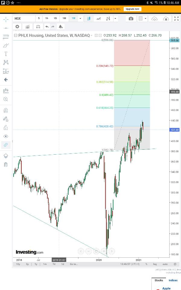 $HGX - For those looking for alternate ways to play the housing market boom, the Philadelphia Housing Index provides a tidy vehicle. A wide range of call and put options are available on this index to capitalize on the the RE bull market that is still in the middle innings in terms of appreciation, not time. Fast approaching is a final speculative melt-up climax high. The chart has recently broken out of a 3 year megaphone pattern, and is targeting 596 for a topping/reversal point.