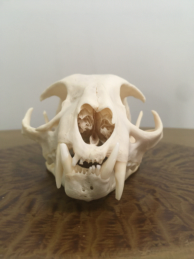 This is a bobcat skull I found some time back. Note that the left side of the skull (his/her left side) droops significantly. The left eye socket is larger too. I am no expert, but his teeth appear to be worn, so he isn't young. I wonder if he was able to live and hunt normally. Did his peers care? Diego