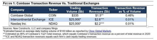 For example, if Coinbase’s revenue share of trading volume fell to 0.01%, equal to traditional stock exchanges, its estimated transaction revenue in the first quarter would have been just $35 million instead of an estimated $1.5 billion.