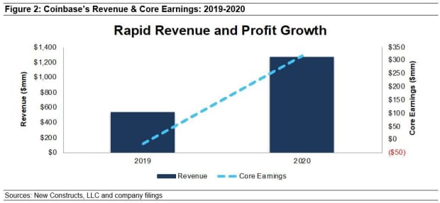 Current profits are a drop in the bucket compared to expectationsCoinbase stands out against recent IPOs due to the fact it actually generates a profit. Coinbase grew revenue by 139% year-over-year in 2020, and core earnings, under our calculation, improved from -$17 million to $317 million over the same time. In the first quarter of 2021, revenue grew more than 9 time year over year (YoY).