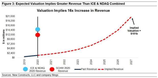 Figure 3 compares the firm’s implied future revenue in this scenario to its historical revenue, and the 2020 revenues of Intercontinental Exchange and Nasdaq combined as well as Schwab’s revenue.