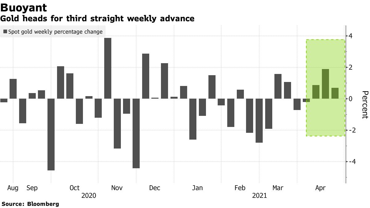Spot gold was little changed at $1,785.08 an ounce at 9:55 a.m. in London and is on track for 0.5% gain this week. Prices dropped 0.6% on Thursday after earlier rising to $1,797.93, the highest level since Feb. 25. Silver declined and platinum advanced, while palladium steadied after surging to a record this week. The Bloomberg Dollar Spot Index retreated 0.3% is poised for a third weekly decline.