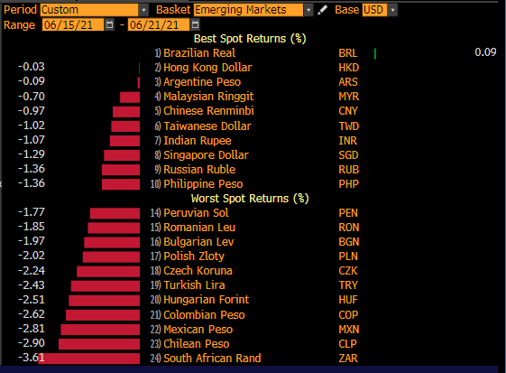 There's only one sliver of green across all EM FX since last week's hawkish Fed surprise: Brazil's Real.