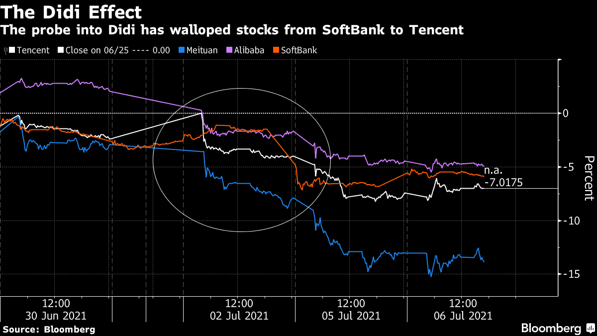 The probe into China’s ride-hailing leader stunned investors and industry executives, hammering the Hong Kong shares of peers from Tencent Holdings Ltd. -- one of Didi’s largest backers -- to Alibaba Group Holding Ltd. and Meituan. Investors worry that the latest security-based probes opened a new front in Xi Jinping’s broader campaign against China’s internet giants that began in November with the collapse of Jack Ma’s Ant Group Co.’s $35 billion IPO and subsequent antitrust investigations into Alibaba and Meituan.
