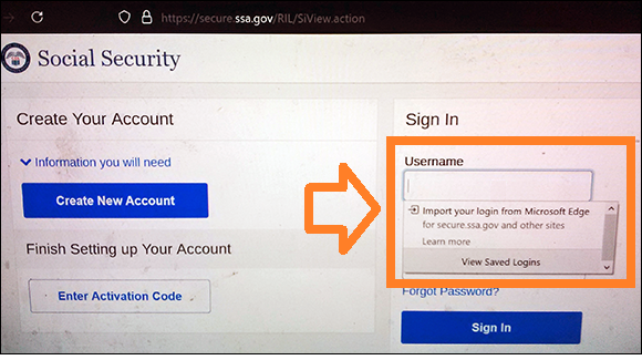 Figure 1. When Edge was installed, it copied the passwords that had been stored by an existing instance of Firefox, a reader claims. When a new version of Firefox was installed without copying any passwords, it asked the user whether it should sign in to sites such as Social Security by importing login credentials from Edge. (I’ve highlighted Firefox’s request with an orange box.) Source: Screen shot from reader’s smartphone