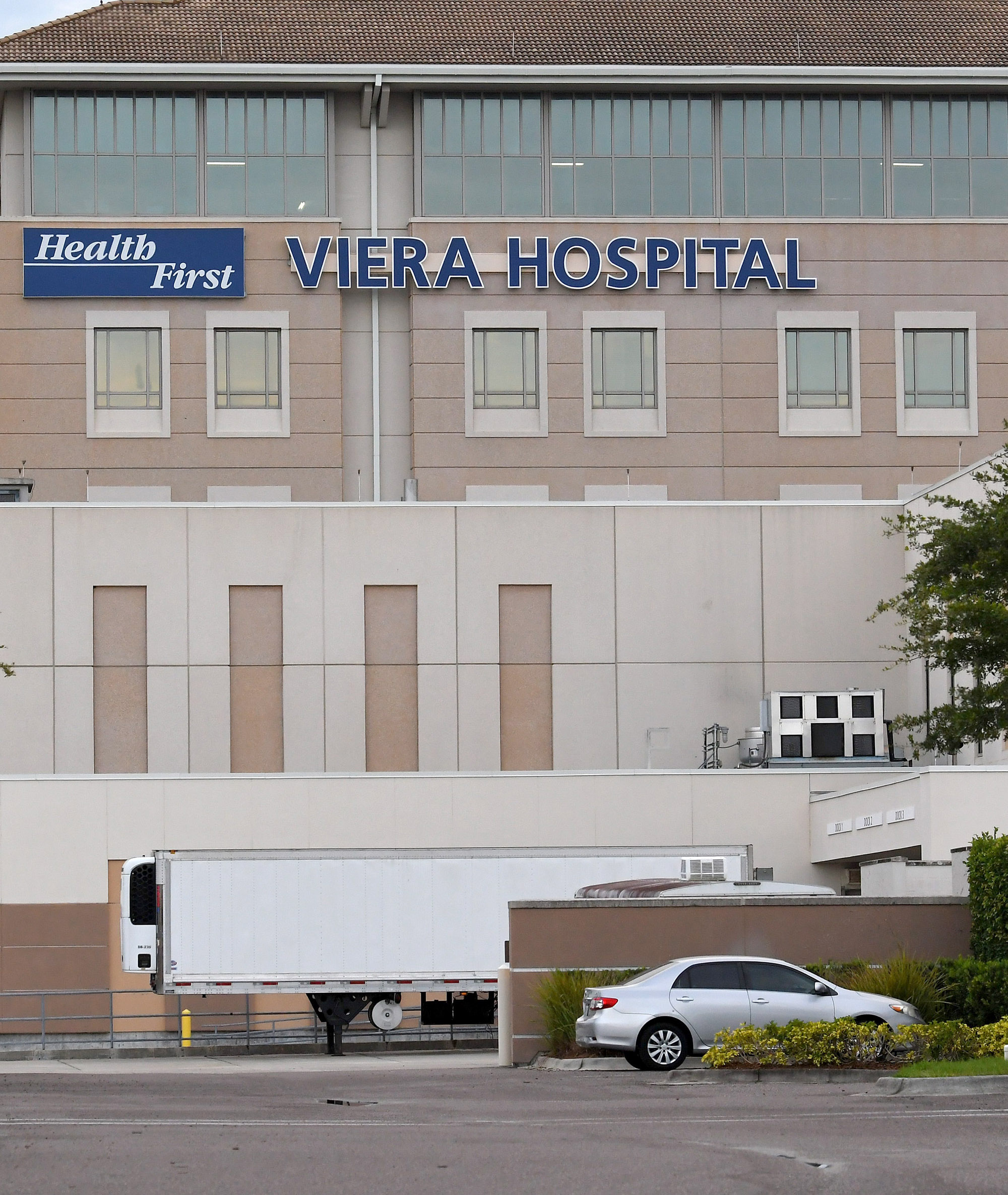 A large refrigerated trailer -- for use as a morgue, if necessary -- parked at the back of Viera hospital in Brevard County, Florida in August.