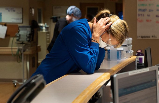 Nurse in Clearwater, Florida after hearing bad news delivered to another family. This photo accompanies my column: The frustration of trying to save lives in a supposedly advanced country where so many foolishly refuse vaccination. twitter.com/DanRodricks/st…