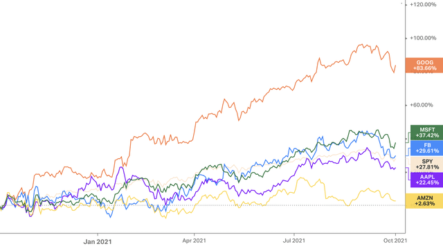 Google’s increasing prominence shows in the stock and underlying business’ performance. Google’s record-setting performance in the first half of the year across all main segments indicates that the consolidated business remains in a robust growth phase. It also sets the right tone for further growth stepping into the second half with the holiday season driving demand, as well as in the years to follow given the global transition to digital as discussed in our previous coverage on the stock. And over the past 12 months, Alphabet's stock has appreciated by more than 80%. The stock’s gains continue to lead the FAANG pack, while consistently outperforming the broader market despite mounting headwinds that have fanned volatility in recent weeks. The stock’s uptrend remains a testament to investors’ optimism on Google’s long-term growth prospects.