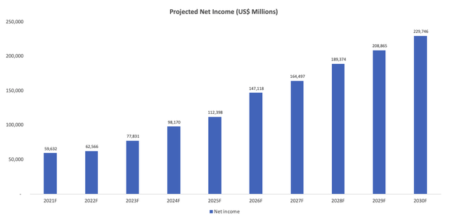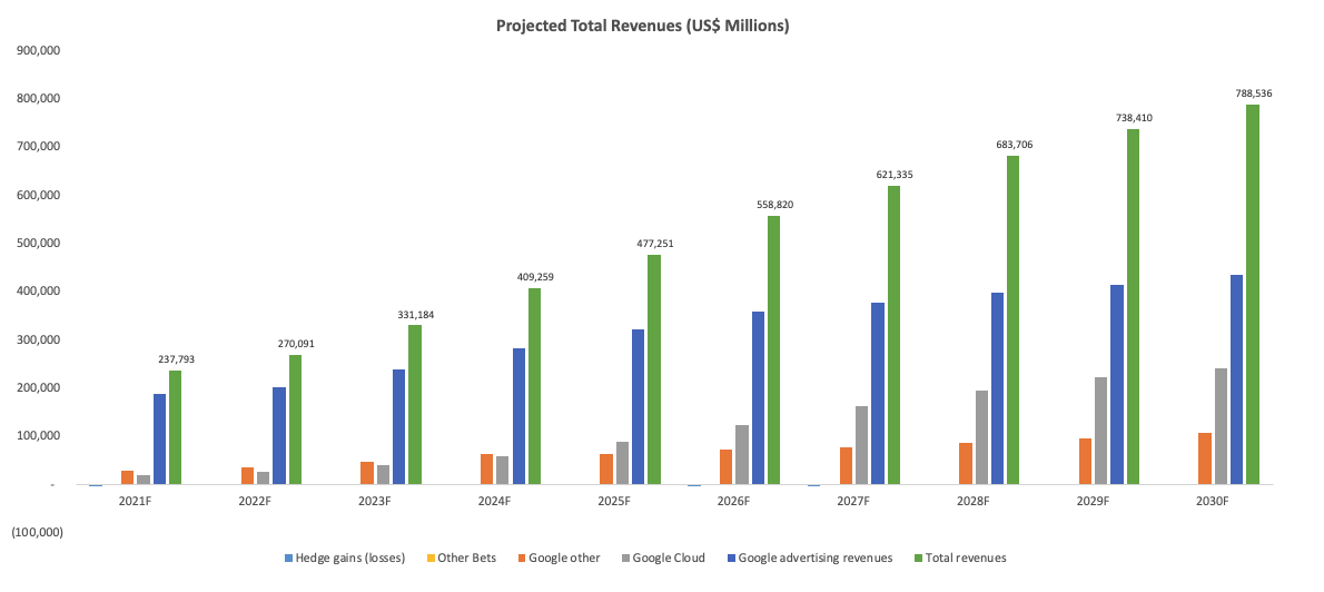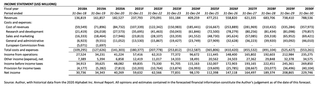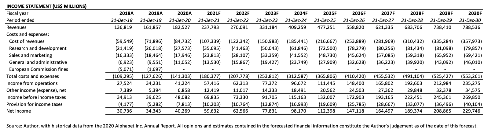 Coupled with other nominal non-operational income and expenses, Google is forecasted to generate consolidated net income of up to $59.6 billion by the end of 2021, with growth towards $229.7 billion by 2030.