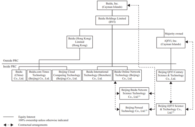 The Bond Market's View on Baidu's RiskLike many Chinese companies listed on U.S. and Hong Kong exchanges, Baidu Inc. is a Cayman Islands holding company utilizing the familiar VIE structure. This means shareholders don't have any ownership interest in the underlying companies based in China like Beijing Baidu Netcom Science Technology, for example. According to BIDU's latest Form 20-F filing, the company's organizational structure on page 107 looks like this:
