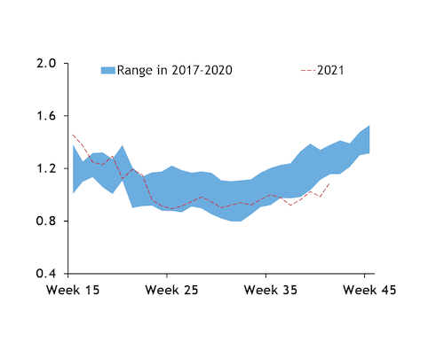 As of last week, industrial gas demand in these eight economies this year had averaged 3.55 TWh/d, slightly higher than the same period in 2020 and 2017, but shy of the averages of 3.56 TWh/d in pre-Covid 2019 and 3.69 TWh/d in 2018.
