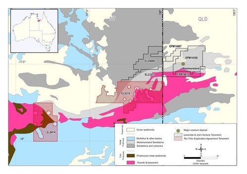 Figure 1 – Murphy Project (CNW Group/Laramide Resources Ltd.) The strategically located Project consists of 683.5 km2 of granted exploration tenure, which lies contiguous to and along strike from Laramide's Westmoreland Project in northwest Queensland. The Northern Territory of Australia is a jurisdiction that is supportive of both uranium development and mining and hosts several well-known deposits including the Ranger Mine which produced in excess of 120,000 tonnes of U3O8 over a 35-year period. The Murphy Uranium Province itself produced high-grade uranium during the 1950s and stands out amongst the world's attractive underexplored uranium provinces, having not seen any meaningful exploration since the 1970s.