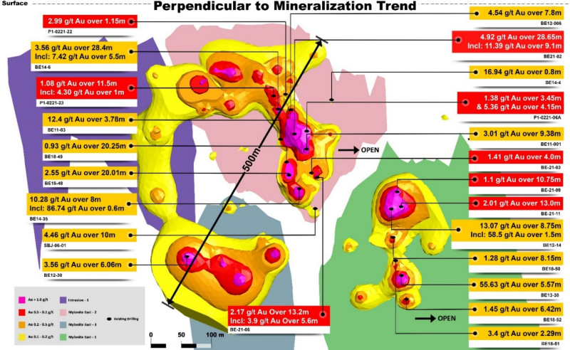 Holes BE-21-08 and BE-21-09 ended up being similar due to deviation in the drilling dip and azimuth due to harsh overburden conditions. Mineralized intervals from BE-21-10 and BE-21-11 were offset respectively 60 metres down-dip and 25 metres along strike from the first two holes.