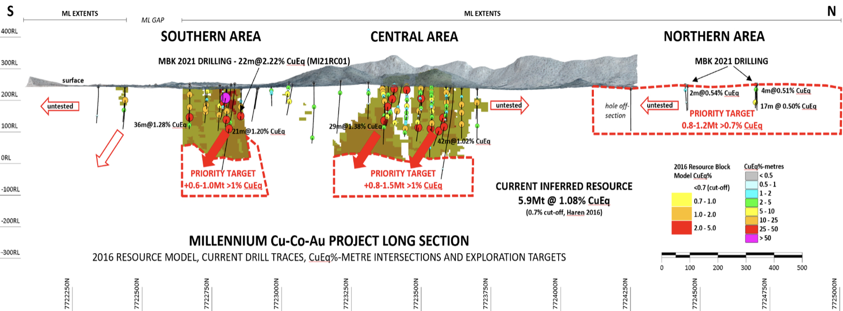 Mapping, soil geochemistry and rock sampling conducted by GEMC identified an additional 1.5 km of anomalous cobalt-copper mineralisation in geological analogues that occur along a potential strike extension in the northern half of the tenement package (“Northern Extension”). This area has no previous drilling to date and provides an excellent opportunity to increase the overall resource potential of the Millennium Project. The Millennium mining leases also include the Corella and Federal prospects, along a parallel zone of significant surface Cu-Co-Au anomalism and historical workings, that are untested by drilling and provide yet further potential to grow the resource base.
