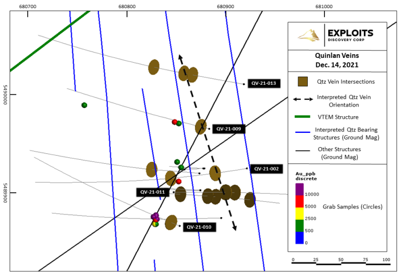 The Quinlan Veins drilling area is located within the Dog Bay Gold Project at the northern extent of the Exploits Subzone. 2021 drilling was planned to test the down dip and strike extension of multiple 50 to 70 cm wide mineralized outcropping quartz veins that produced high-grade grab samples (up to 61.3 g/t Au, Feb. 9th release). Drill results indicate that some vein intersections display similar orientations to the interpreted north-to-north northwest trending geophysical lineaments identified from ground magnetic geophysical interpretation.