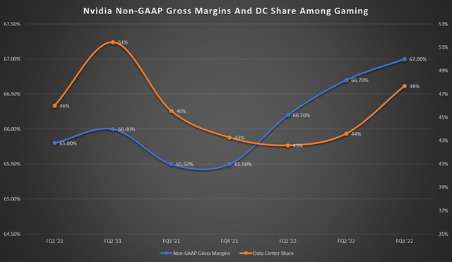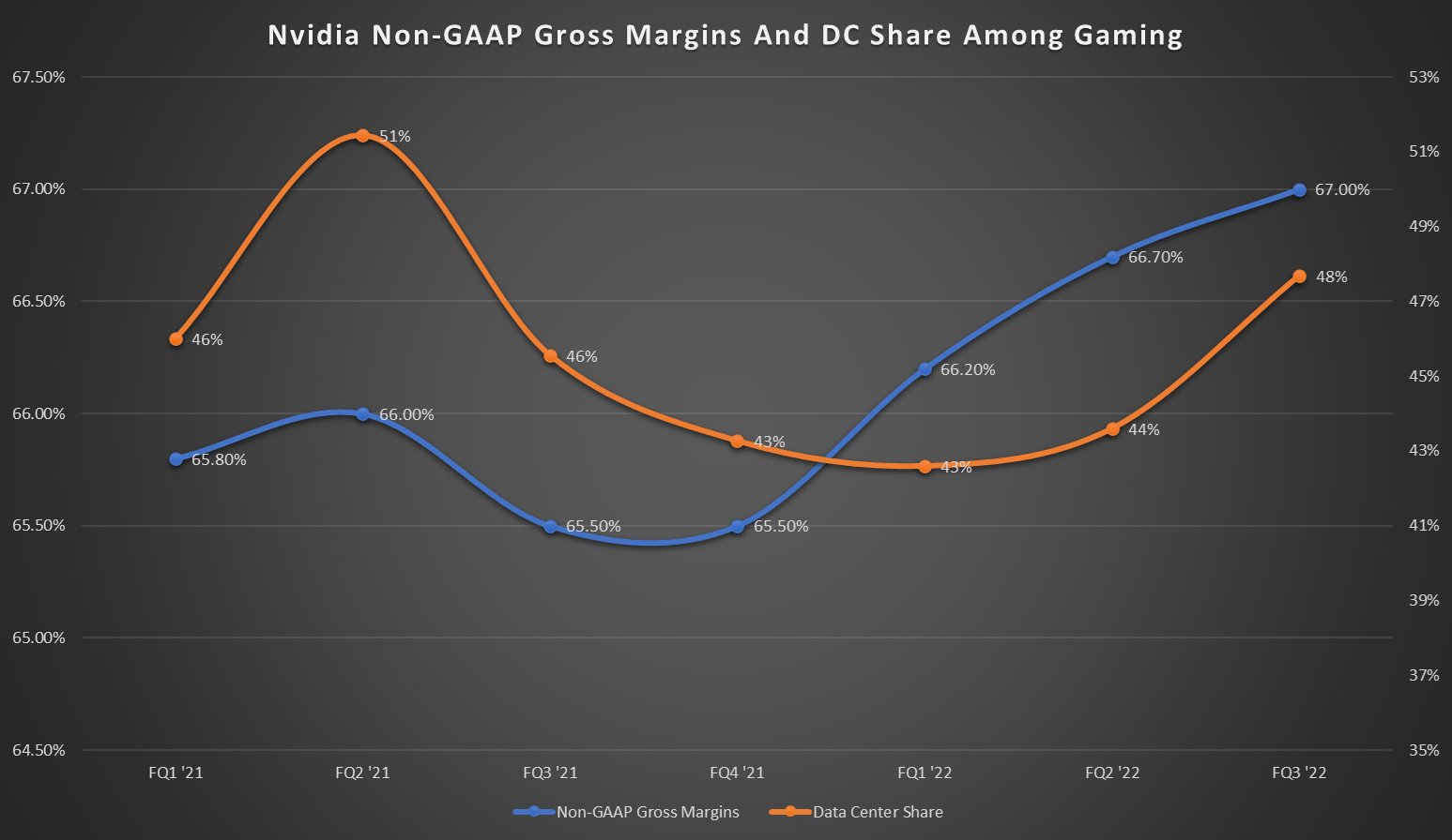 Digging further, notice which division's Q/Q growth aligns with gross margins. And, more precisely, the makeup of Data Center's revenue share between it and Gaming is what is driving gross margin trends (calculated as (DC)/(DC+Gaming)), as shown below. Data Center moving into the number one position is exactly what investors should want as it drives gross margins higher. The Omniverse and Metaverse story aligns perfectly with a more significant Data Center division. And it helps Nvidia has been pushing for Data Center growth over the last several years, well before the Mellanox acquisition was announced in 2019, because the company is ahead of the curve needed in the tech industry to be ready for metaverse demands.