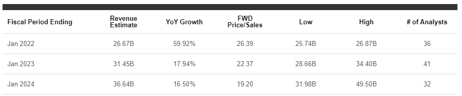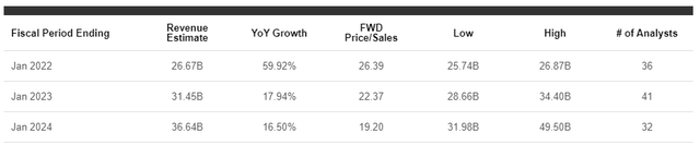 With the price-to-sales ratio near relatively historical highs, the market is saying it expects 50% revenue growth to continue over the next three years. This, therefore, means the market is expecting consensus estimates to rise pretty significantly over the next year or so. As a result, the company would have to hit slightly above the 'High' estimate shown below for 2023 and 2024 to justify the valuation.