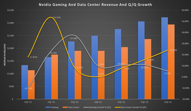 As the quarter-over-quarter lines on the secondary axis show, Data Center has accelerated growth since FQ4 '21, while Gaming growth has slowed since FQ1 '22. The large growth in FQ2 '21 has to do with the Mellanox acquisition, and because the growth I'm outlining starts in FQ4 '21, it becomes independent of Mellanox as the comparisons are Q/Q and not Y/Y. This is especially true after three quarters of nominal sequential growth between FQ3 '21 and FQ1 '22.
