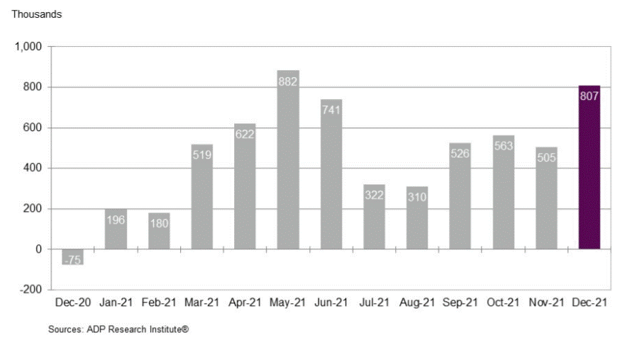 “December’s job market strengthened as the fallout from the Delta variant faded and Omicron’s impact had yet to be seen,” said Nela Richardson, chief economist, ADP. “Job gains were broad-based, as goods producers added the strongest reading of the year, while service providers dominated growth. While job gains eclipsed 6 million in 2021, private sector payrolls are still nearly 4 million jobs short of pre-COVID-19 levels.”