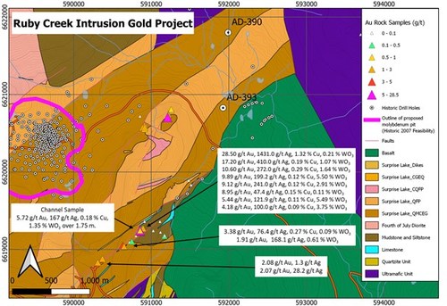 David O'Brien, President and CEO commented "The identification of free gold in sheeted veinlets from the historic Adanac Molybdenum condemnation drill core is great news as it supports our speculation of a potential intrusion-related gold bearing system in the area and another possible source for the incredible placer gold endowment of Ruby Creek and the Atlin camp."