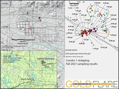 PIEDMONT, QC, Jan. 11, 2022 /CNW Telbec/ - Goldflare Exploration Inc. (TSXV: GOFL) ("Goldflare" or the "Company") announces that the 2021 surface exploration program was successful to identify a new gold-bearing sector on its Syenite Condor project located about 30 km north-east of Rouyn-Noranda, Abitibi (Quebec). Prospecting rock sampling results received so far reach locally values between 1 and 10 g/t.