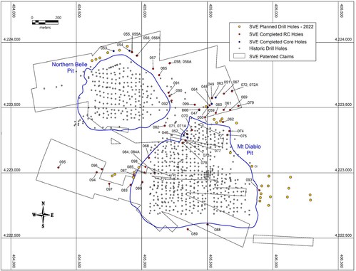 Figure 1. Drill hole locations of planned holes and previous holes in the Mount Diablo and Northern Belle pits area. The upcoming drill program will consist of up to 32 holes and will concentrate on two main goals. It will continue to examine and potentially expand near-surface silver-oxide mineralization along strike from the previously mined Mount Diablo and Northern Belle open-pits (Fig. 1). Drilling will also fill in areas along the potential extensions to the higher-grade, down-dip continuation of the mineralized system. Drilling in 2020-2021 intercepted multiple high-grade intervals in the hundreds of grams per metric tonne ("g/t") silver with significant gold values. These higher grade intercepts were outlined in the Company's July 15, 2021 news release, where a high-grade intercept of 1,070 g/t silver and 1.48 g/t gold over 4.57 meters, within a 25.91-meter interval that averaged 248.5 g/t silver and 0.40 g/t gold in hole SO-C-21-92 was reported and in a May 26, 2021 Company news release where a high-grade intercept of 1,776 g/t silver and 2.55 g/t gold over 1.52 meters, within a 7.62-meter interval that averaged 563 g/t silver and 0.73 g/t gold in hole SO-C-21-73 was delineated.