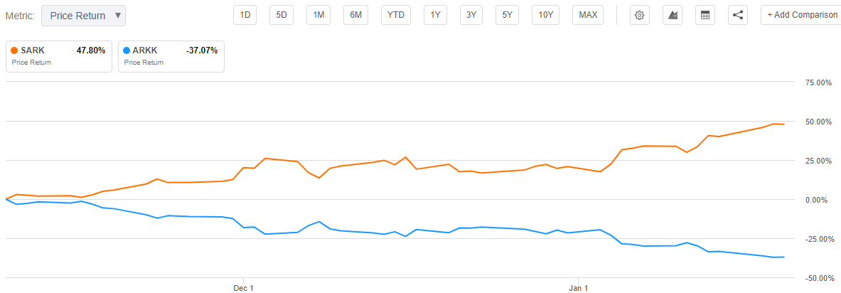 SARK aims to achieve a -1X inverse return of ARKK for a single day and not for any other period. Moreover, the two exchange traded funds have experienced a 45.3% performance differential so far this year. See below the return comparisons between SARK and ARKK since SARK’s inception back on Nov 9: