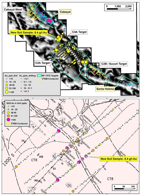 - The C2B target; A corridor of 2.1 km extent, immediately northwest of Santa Helena. The target is associated with aerial conductivity anomalies, favourable geochemistry and encouraging results from historical reconnaissance drilling.