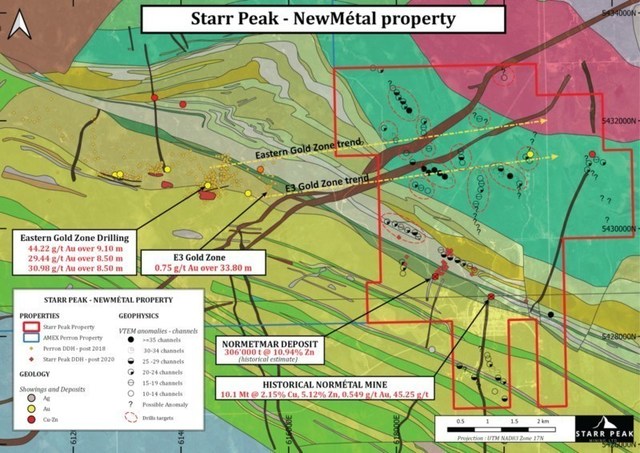 Figure 1: Geological Map of the NewMétal property and its 2021 VTEM anomalies with respect to Amex Exploration’s Perron Project Eastern and E3 Gold Zones. (CNW Group/Starr Peak Mining Ltd.) The ongoing drilling program continues to target both the Normetmar Deep Zone below 600m vertical depth and the 4 km long prolific Normetmar-Normétal lithological contact within the property, taking into account the many new massive sulphide intercepts in 2021. The Normetmar Deep Zone is located directly below the Normetmar high-grade zinc deposit and approximately one kilometre west of the historic Normétal Mine which produced ~10.1M tonnes of 2.15% Cu, 5.12% Zn, 0.549 g/t Au, and 45.25 g/t Ag (Boivin, 1988).