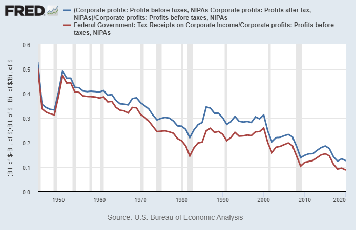 The tax base has shifted away from taxes on corporate profits, and more towards payroll taxes, which are paid by workers (the employee side) and by companies that employ a lot of workers (the employer side). The big winners of this tax shift are labor-light companies (software, pharmaceuticals, finance, and so forth) that don’t need to employ a lot of domestic workers to earn high revenue.