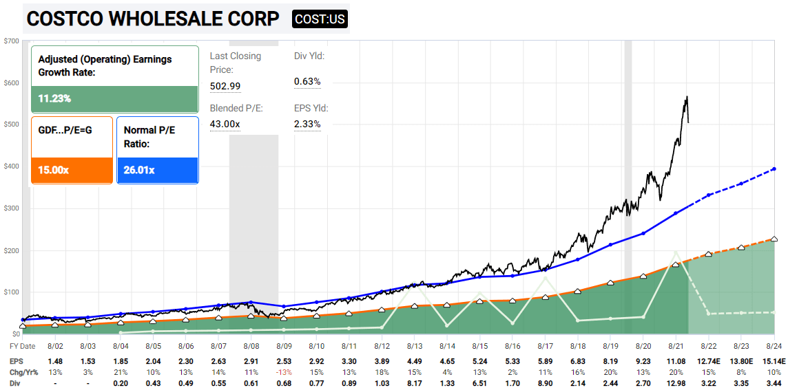 Does that mean I think Costco ( COST) is topping at these lofty levels? Maybe, but not necessarily. That’s too specific of a call. I think over the very long term, it’s a great company and at certain price points will be a good investment, like it often has been in the past for nearly four decades since it was founded.